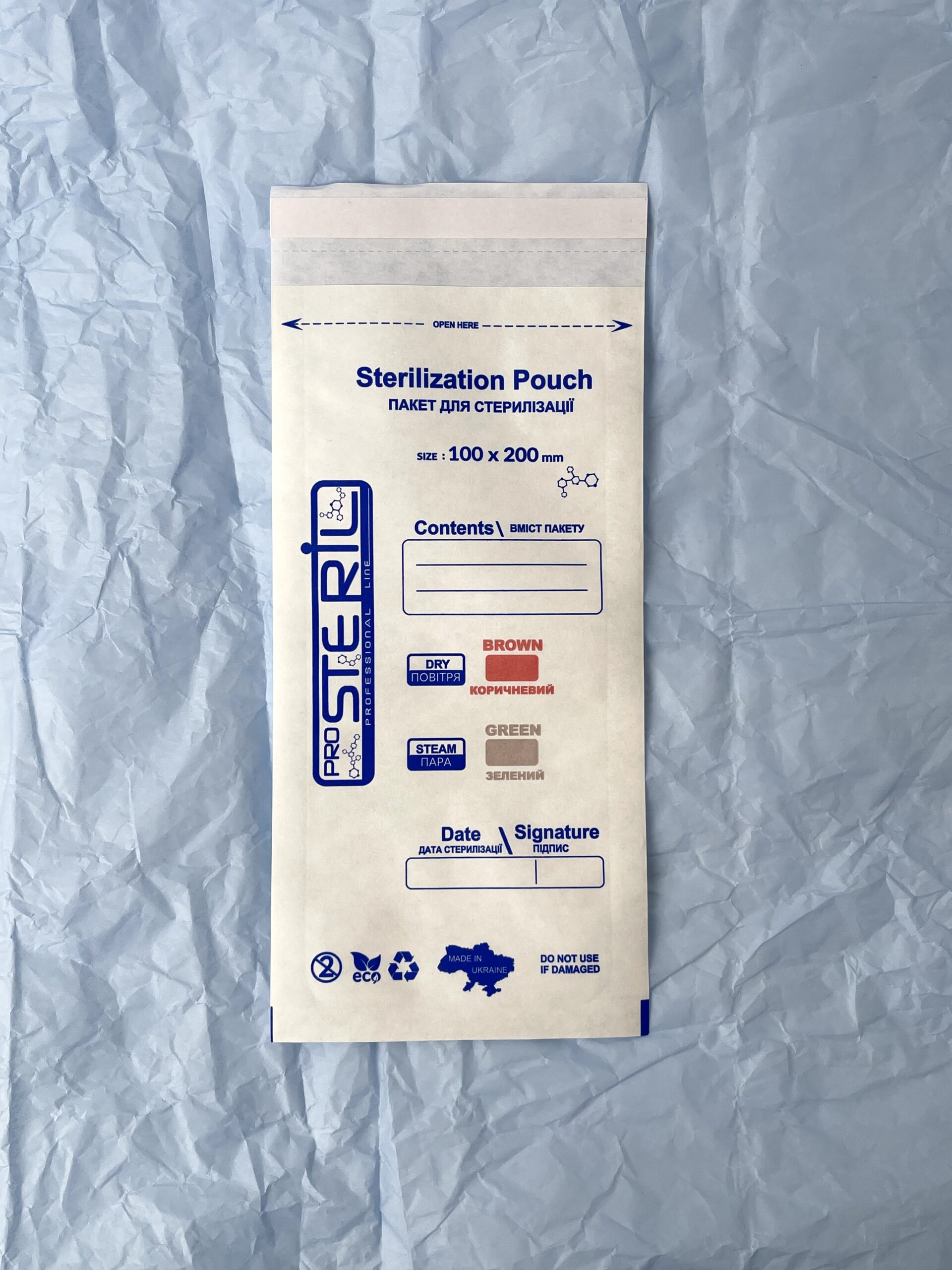 Пакети 100*200 мм БІЛІ з крафт паперу PREMIUM якості (100% крафт папір). Самоклеючі. Застосовуються для підтримки стерильності інструментів при зберіганні. На зовнішній стороні крафт пакета розміщений індикатор 4 класу, що зміною кольору дозволяє відрізнити простерилізований інструмент від нестирилізованого. Термін збереження стерильності до 24 місяців.