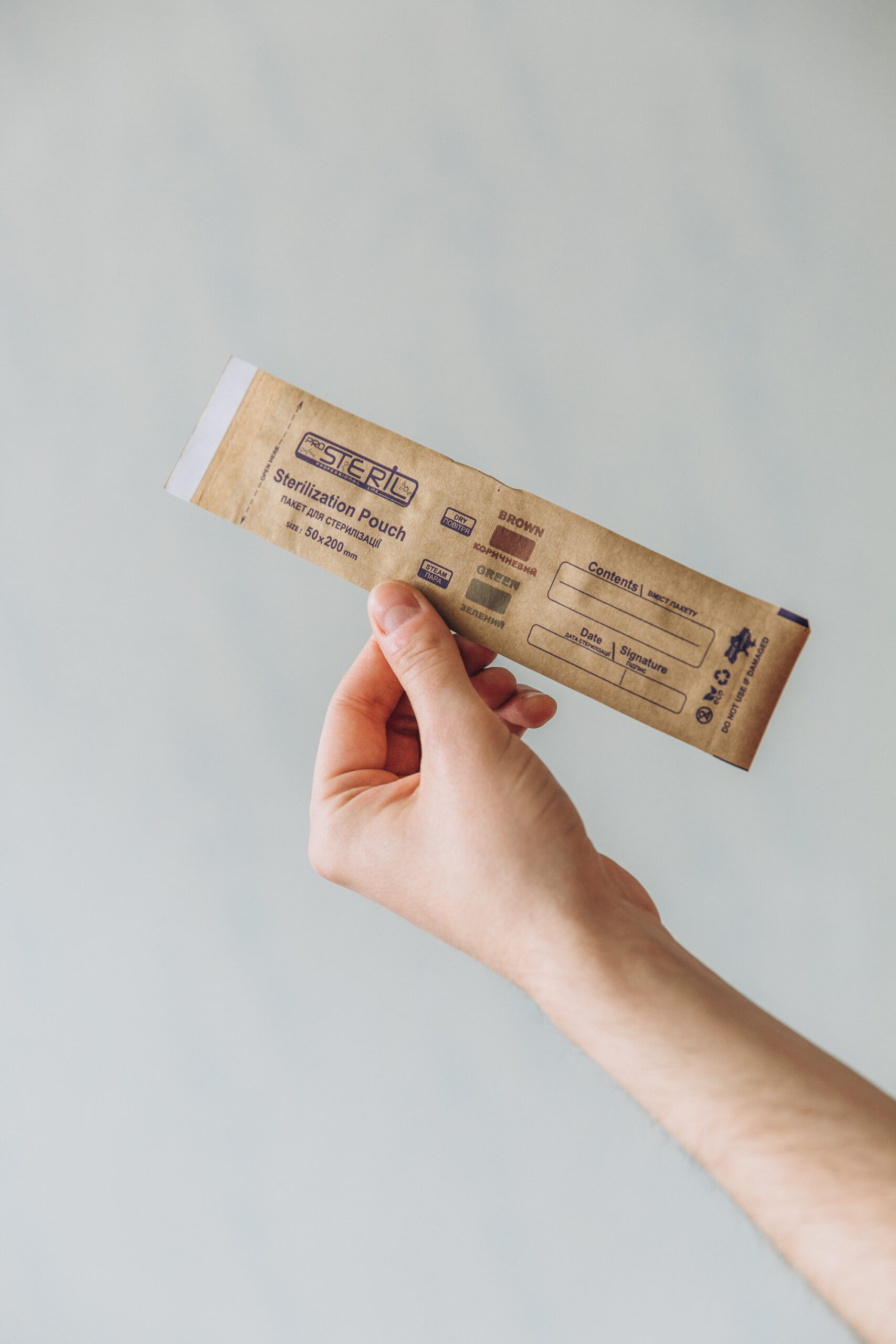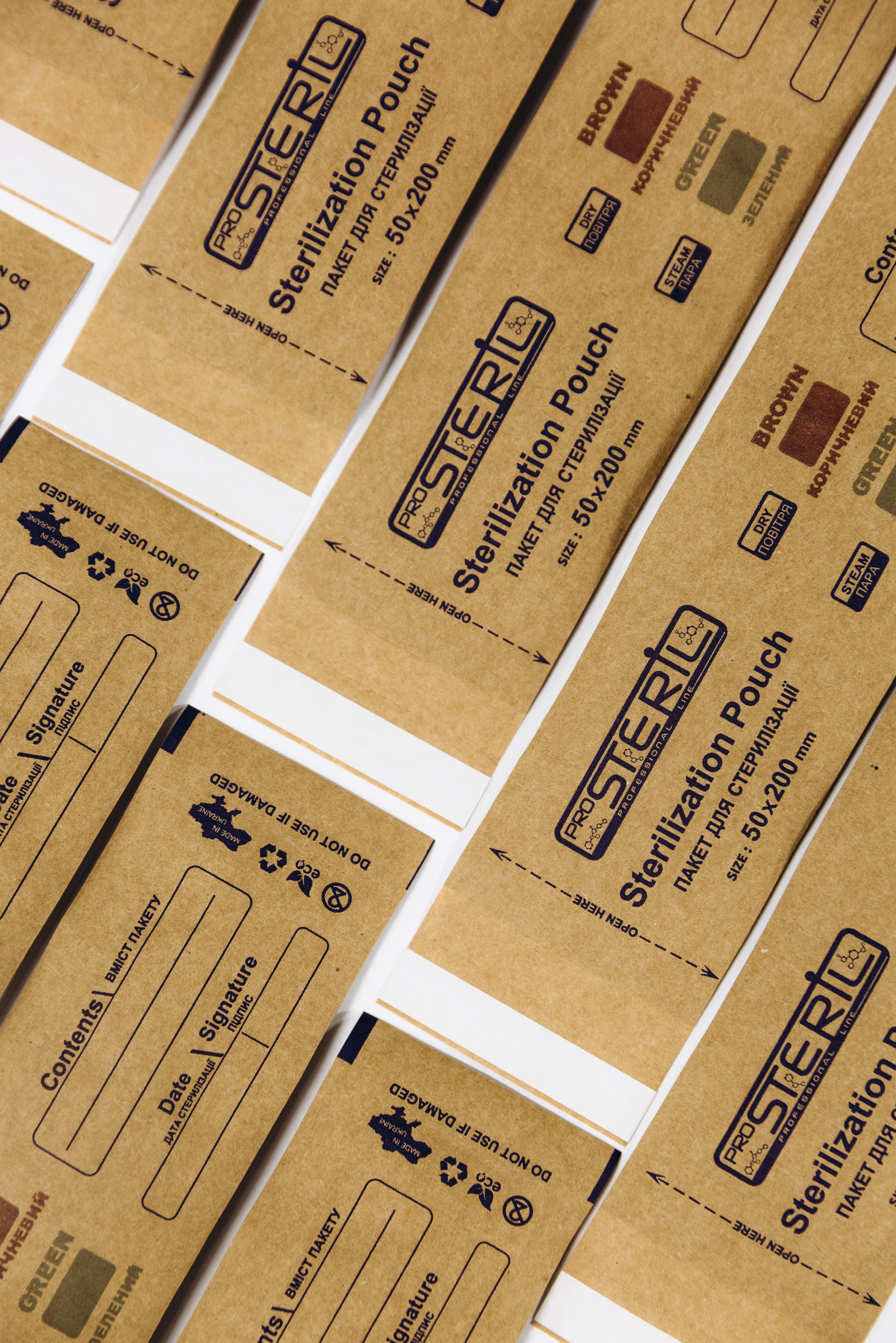 Пакети 50*200 мм БУРІ з крафт паперу PREMIUM якості (100% крафт папір). Самоклеючі. Застосовуються для підтримки стерильності інструментів при зберіганні. На зовнішній стороні крафт пакета розміщений індикатор 4 класу, що зміною кольору дозволяє відрізнити простерилізований інструмент від нестирилізованого. Термін збереження стерильності до 24 місяців.