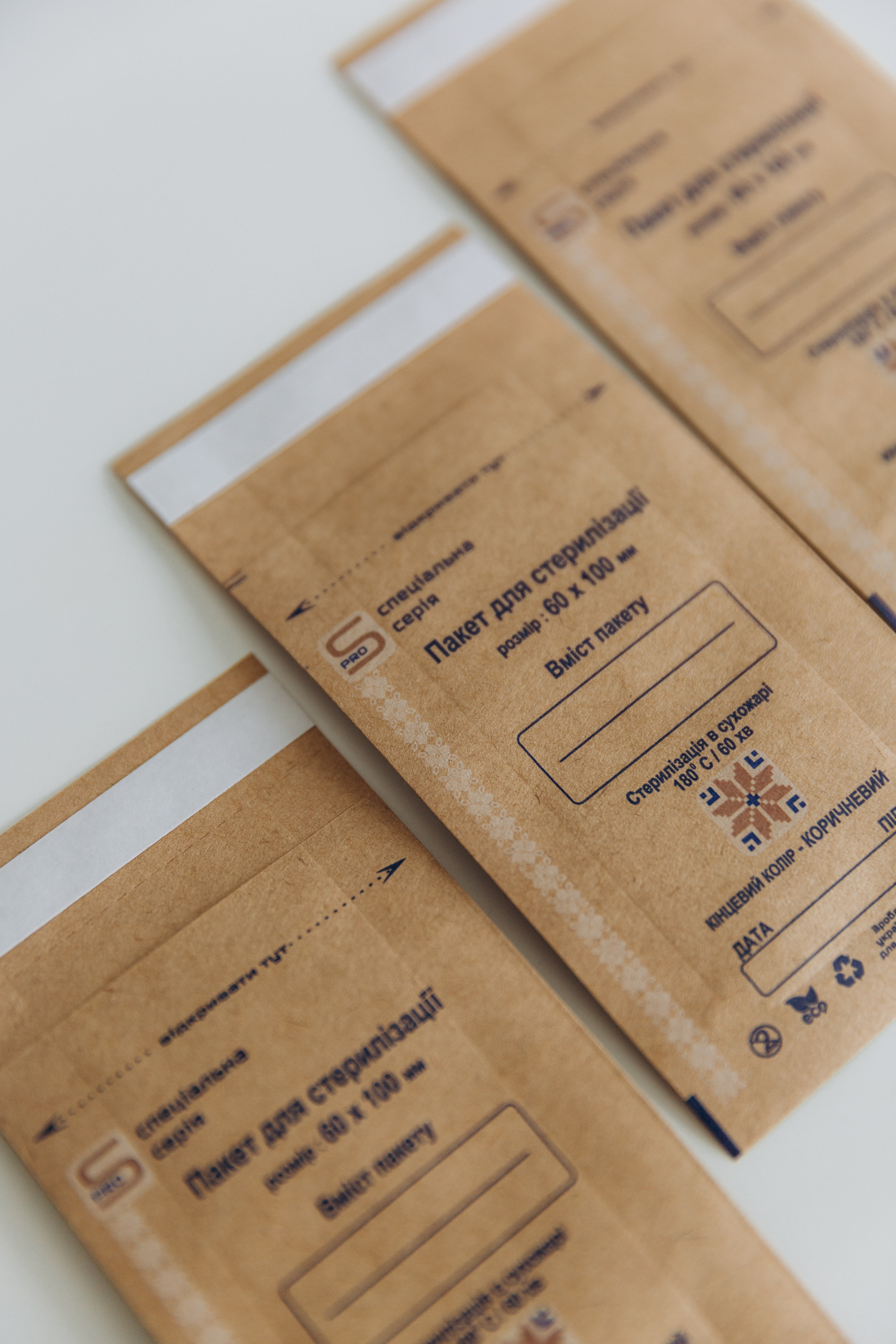 Самоклеючі. Застосовуються для підтримки стерильності інструментів при зберіганні. На зовнішній стороні крафт пакета розміщений індикатор 4 класу, що зміною кольору дозволяє відрізнити простерилізований інструмент від нестирилізованого. Термін збереження стерильності до 24 місяців.