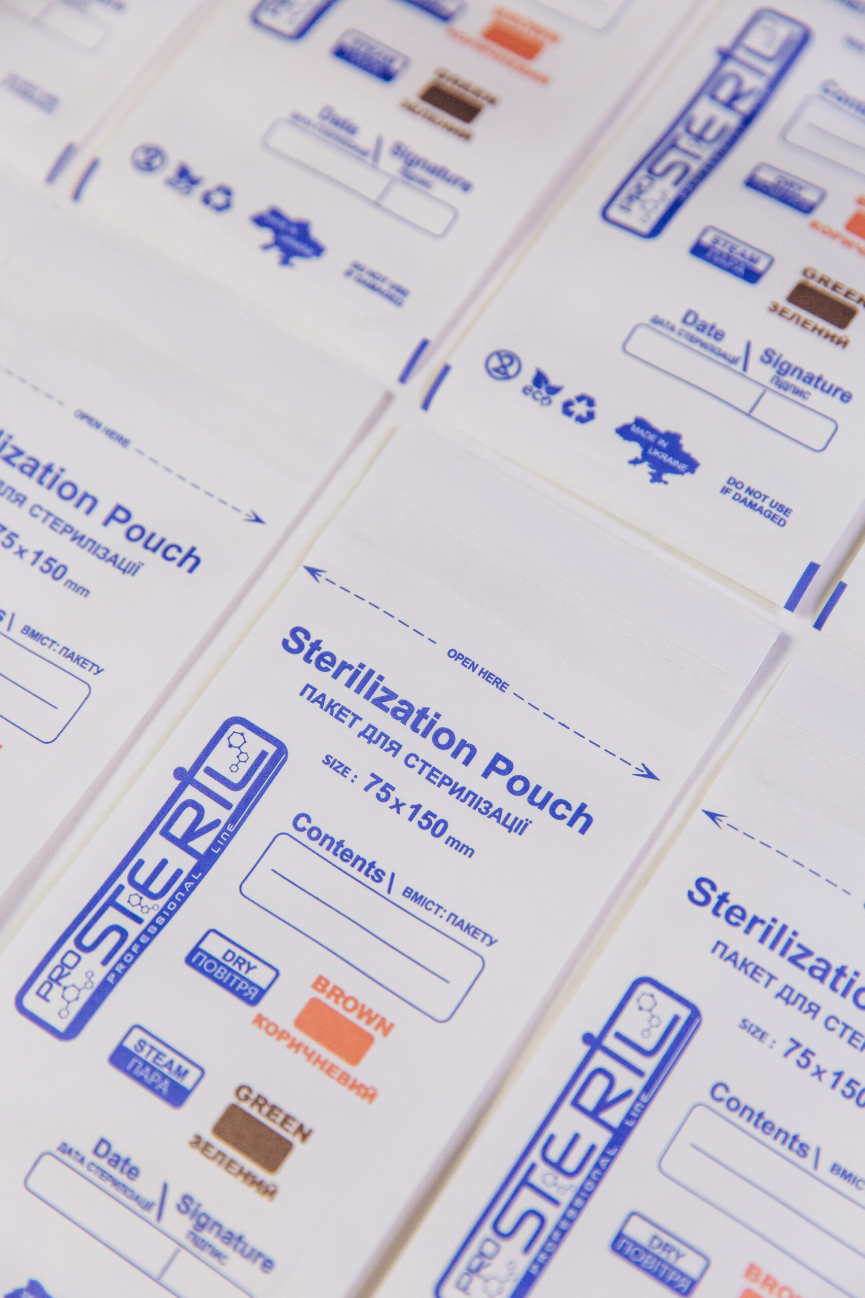 Пакети 75*150 мм БІЛІ з крафт паперу PREMIUM якості (100% крафт папір). Самоклеючі. Застосовуються для підтримки стерильності інструментів при зберіганні. На зовнішній стороні крафт пакета розміщений індикатор 4 класу, що зміною кольору дозволяє відрізнити простерилізований інструмент від нестирилізованого. Термін збереження стерильності до 24 місяців.
